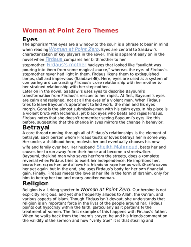 Woman At Point Zero Analysis. Women At Point Zero Analysis. The novel Woman at Point Zero by Nawal El Saadawi tells a story of a woman Firdaus born in Egypt who suffers through many.